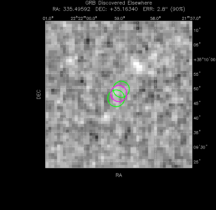 The image below shows the UVOT field with the final, astrometrically corrected XRT refined position. The image is 50" to a side, and contains 5e+03 s of data in the UVW2 filter.