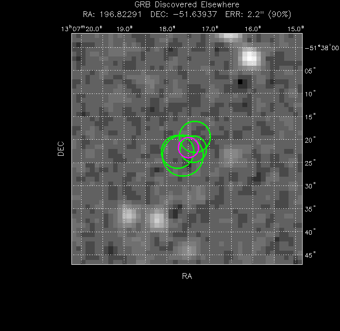 The image below shows the UVOT field with the final, astrometrically corrected XRT refined position. The image is 50" to a side, and contains 1e+03 s of data in the WHITE filter.