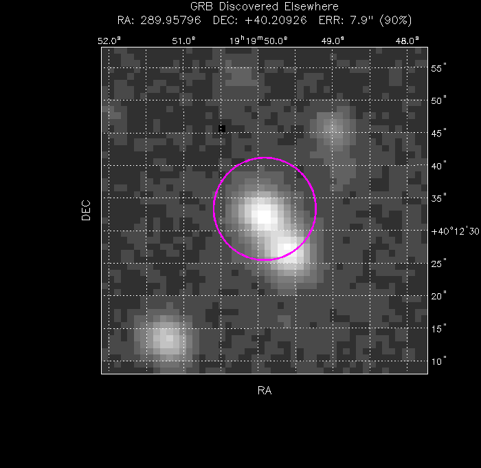 The image below shows the UVOT field with the final, astrometrically corrected XRT refined position. The image is 50" to a side, and contains 5e+03 s of data in the U filter.
