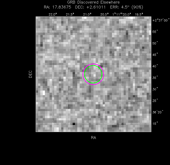 The image below shows the UVOT field with the final, astrometrically corrected XRT refined position. The image is 50" to a side, and contains 5e+03 s of data in the U filter.