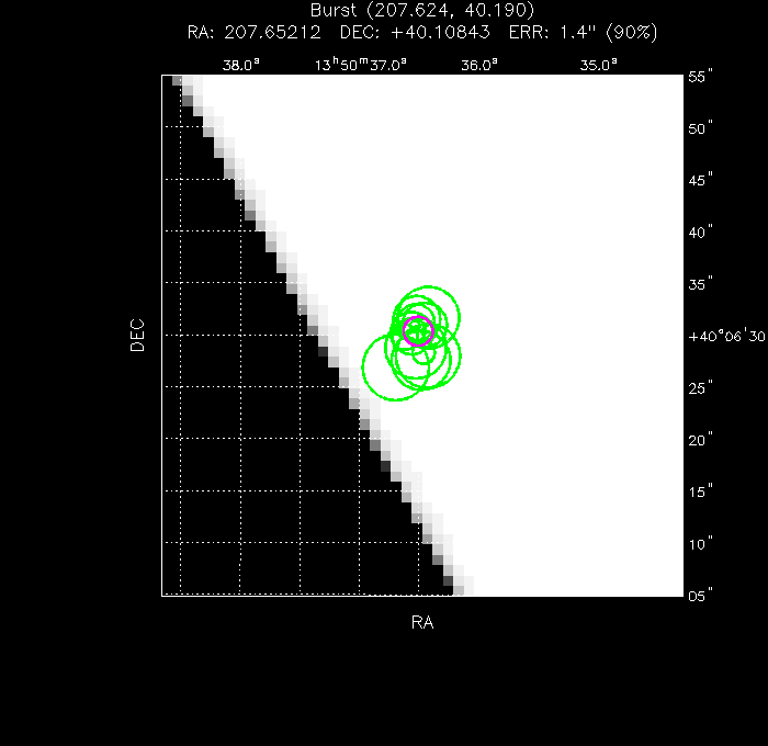 The final position (magenta) is the weighted mean of 14 positions (green). A further 0 positions were rejected, either because they had too few photons to be secure (red) or because they are more than 3 sigma away from the mean position, more than 40" from the early mean, or had a problematic astrometric correction (yellow). The image is 50" to a side.