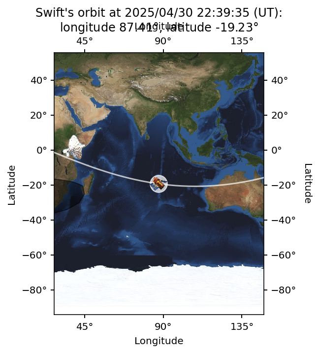 The image above shows position of Swift and its current orbit around the Earth. The radio dish shows the location of the Malindi ground station, and the darker, shaded region over the southern Atlantic region is the SAA.