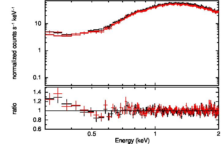 If the data/model ratio rapidly turns up or down below ~0.35-0.4 keV (depending on the epoch of the observation), this region of the spectrum should be ignored.