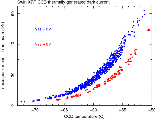 Experimental data taken with the flight spare CCD at the Leicester calibration facility had shown that by raising the substrate to 6V, the CCD dark current level would be reduced. This has been confirmed in orbit: Figure 15 below shows a measure of the thermally-induced dark current (calculated as the mean of the noise peak minus the mean of the bias level) as a function of CCD temperature, with the CCD substrate voltage at both 0V (blue circles) and 6V (red triangles). This shows the benefit of raising the substrate voltage: for the same level of dark current, the CCD can operate 3 to 4C higher with the substrate voltage at 6V compared with 0V, and thus can provide useful scientific data at hotter temperatures.
