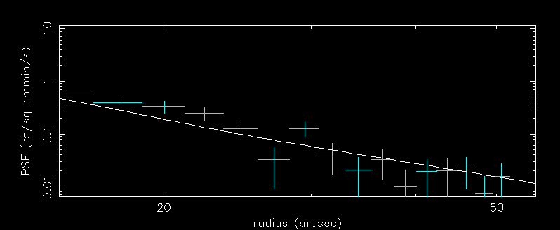 Now the model should be compared to the centre of the PSF, to determine the point at which it no longer fits the data. This is the radius which should be excluded when extracting spectra or light-curves in XSELECT. It may be useful to change the y-axis scaling as well, to be able to see the plot more clearly. rescale can be used with or without limits. fit plot 100 smooths the model line.
