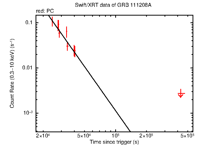 This light curve comes from the light curve repository (if you use it, please cite Evans et al [2007, 2009]. Flares, marked by cross-hatched regions, are identified automatically, but may have been manually corrected. These are excluded from the fit. Any power-law breaks added to the fit must be required at the 4-σ level (according to an f-test) to be included in the best-fit. Details of all fits attempted are given below the plot. For more information see the light curve fitting documentation.