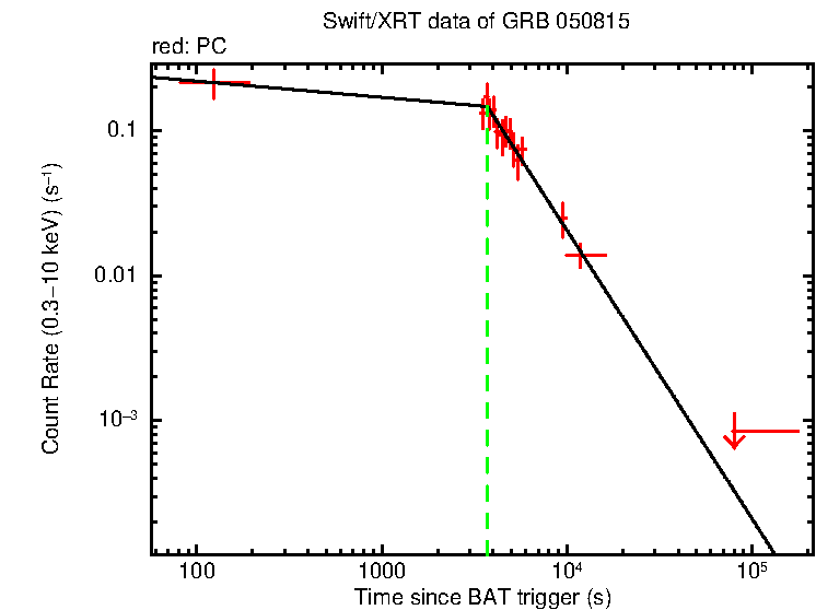 This light curve comes from the light curve repository (if you use it, please cite Evans et al [2007, 2009]. Flares, marked by cross-hatched regions, are identified automatically, but may have been manually corrected. These are excluded from the fit. Any power-law breaks added to the fit must be required at the 4-σ level (according to an f-test) to be included in the best-fit. Details of all fits attempted are given below the plot. For more information see the light curve fitting documentation.