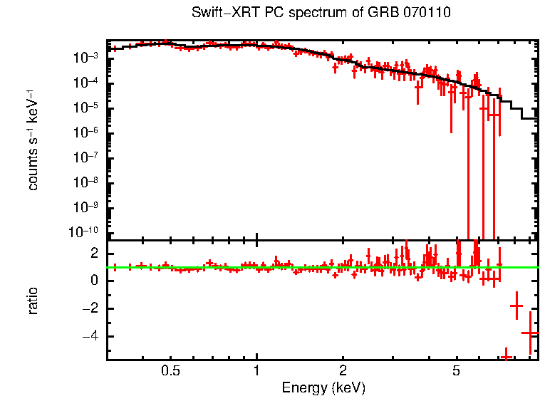 The plots below show the probability density functions of the temporal and time-averaged spectral parameters for all GRBs, with the data for GRB 070110 shown on in colour. Click the images for larger versions.