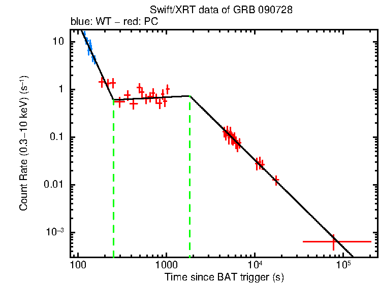 This light curve comes from the light curve repository (if you use it, please cite Evans et al [2007, 2009]. Flares, marked by cross-hatched regions, are identified automatically, but may have been manually corrected. These are excluded from the fit. Any power-law breaks added to the fit must be required at the 4-σ level (according to an f-test) to be included in the best-fit. Details of all fits attempted are given below the plot. For more information see the light curve fitting documentation.