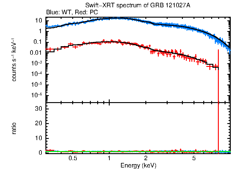 The plots below show the probability density functions of the temporal and time-averaged spectral parameters for all GRBs, with the data for GRB 121027A shown on in colour. Click the images for larger versions.