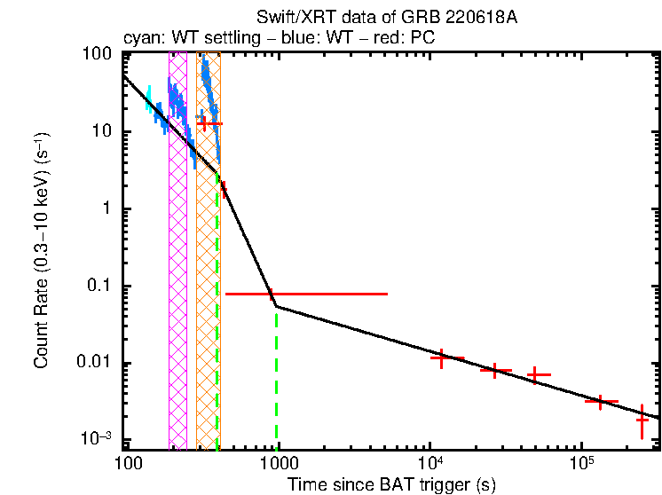 This light curve comes from the light curve repository (if you use it, please cite Evans et al [2007, 2009]. Flares, marked by cross-hatched regions, are identified automatically, but may have been manually corrected. These are excluded from the fit. Any power-law breaks added to the fit must be required at the 4-σ level (according to an f-test) to be included in the best-fit. Details of all fits attempted are given below the plot. For more information see the light curve fitting documentation.
