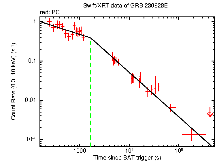 This light curve comes from the light curve repository (if you use it, please cite Evans et al [2007, 2009]. Flares, marked by cross-hatched regions, are identified automatically, but may have been manually corrected. These are excluded from the fit. Any power-law breaks added to the fit must be required at the 4-σ level (according to an f-test) to be included in the best-fit. Details of all fits attempted are given below the plot. For more information see the light curve fitting documentation.