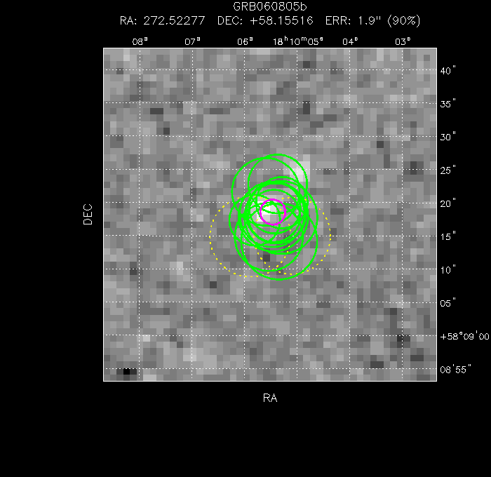 The image below shows the UVOT field with the final, astrometrically corrected XRT refined position. The image is 50" to a side, and contains 2e+03 s of data in the V filter.