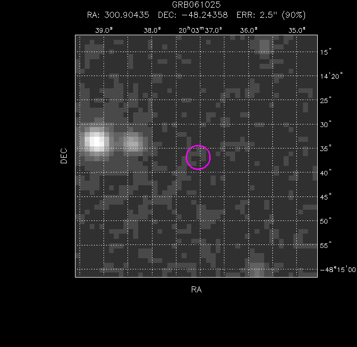 The image below shows the UVOT field with the final, astrometrically corrected XRT refined position. The image is 50" to a side, and contains 3e+03 s of data in the B filter.