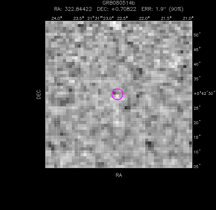 The image below shows the UVOT field with the final, astrometrically corrected XRT refined position. The image is 50" to a side, and contains 351 s of data in the V filter.