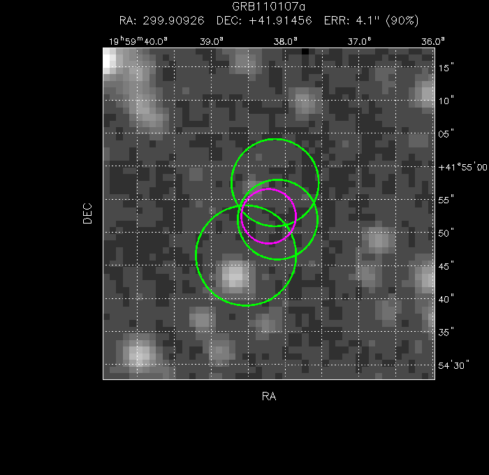 The image below shows the UVOT field with the final, astrometrically corrected XRT refined position. The image is 50" to a side, and contains 2e+03 s of data in the V filter.