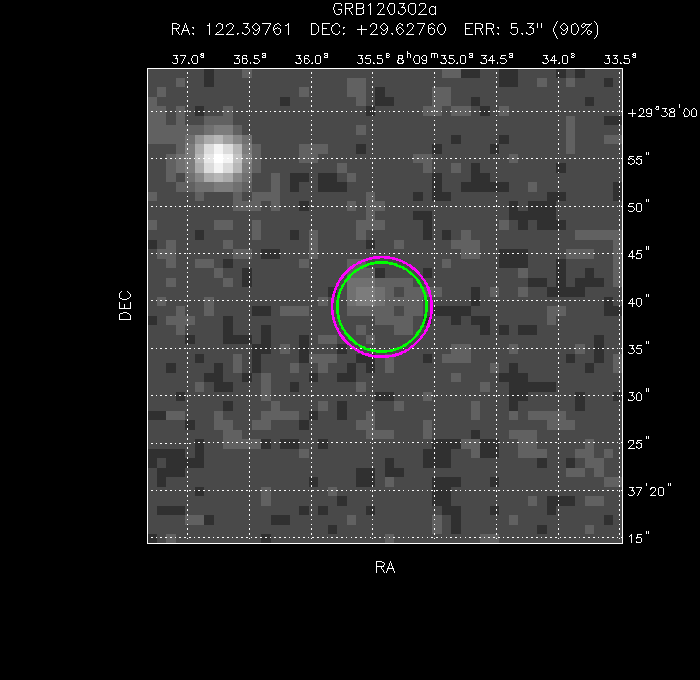 The image below shows the UVOT field with the final, astrometrically corrected XRT refined position. The image is 50" to a side, and contains 5e+03 s of data in the U filter.