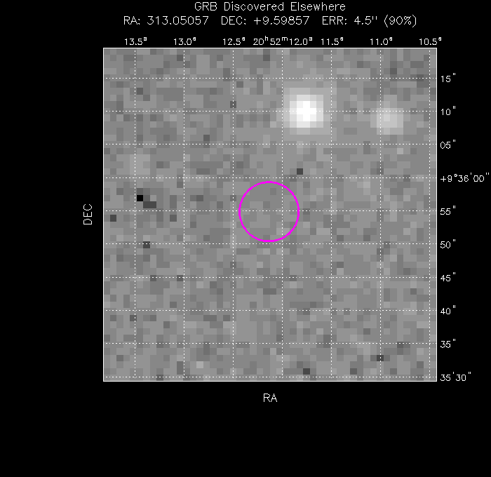 The image below shows the UVOT field with the final, astrometrically corrected XRT refined position. The image is 50" to a side, and contains 1e+03 s of data in the UVW1 filter.