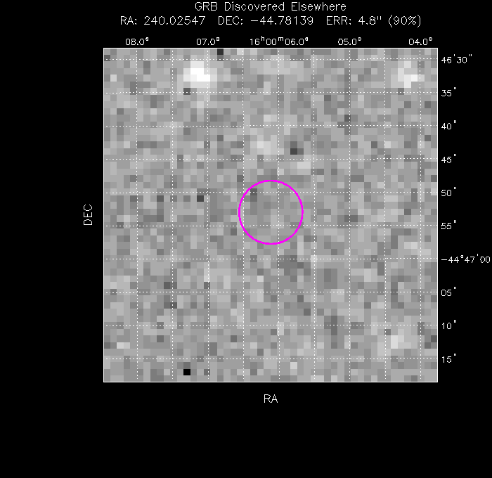 The image below shows the UVOT field with the final, astrometrically corrected XRT refined position. The image is 50" to a side, and contains 180 s of data in the U filter.