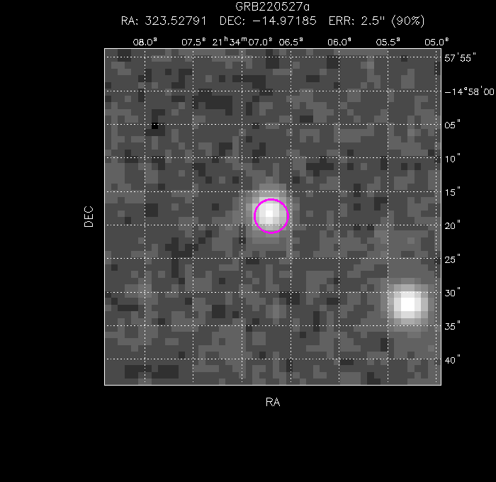 The image below shows the UVOT field with the final, astrometrically corrected XRT refined position. The image is 50" to a side, and contains 5e+03 s of data in the U filter.
