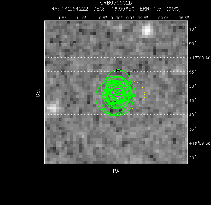 The image below shows the UVOT field with the final, astrometrically corrected XRT refined position. The image is 50" to a side, and contains 1e+04 s of data in the B filter.