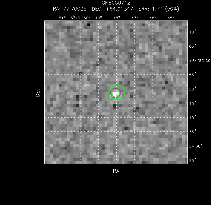 The image below shows the UVOT field with the final, astrometrically corrected XRT refined position. The image is 50" to a side, and contains 1e+03 s of data in the V filter.