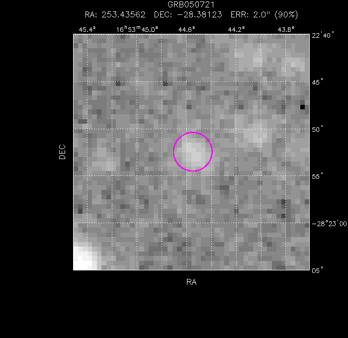 The image below shows the UVOT field with the final, astrometrically corrected XRT refined position. The image is 50" to a side, and contains 271 s of data in the V filter.