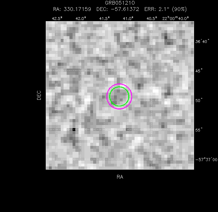 The image below shows the UVOT field with the final, astrometrically corrected XRT refined position. The image is 50" to a side, and contains 97 s of data in the WHITE filter.