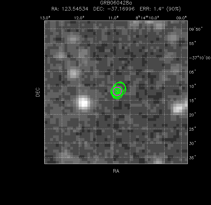 The image below shows the UVOT field with the final, astrometrically corrected XRT refined position. The image is 50" to a side, and contains 2e+03 s of data in the V filter.