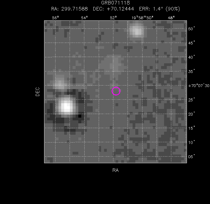 The image below shows the UVOT field with the final, astrometrically corrected XRT refined position. The image is 50" to a side, and contains 637 s of data in the WHITE filter.