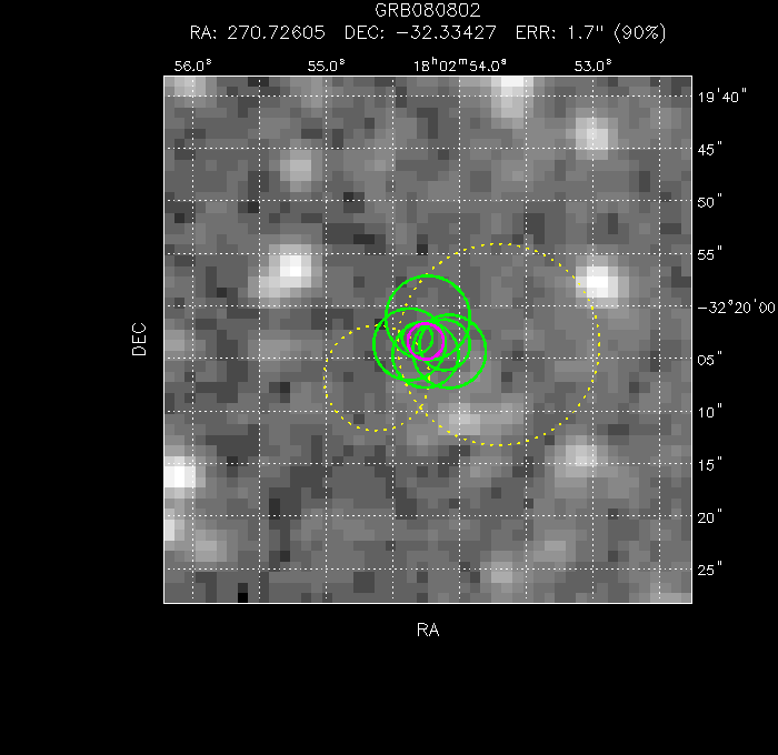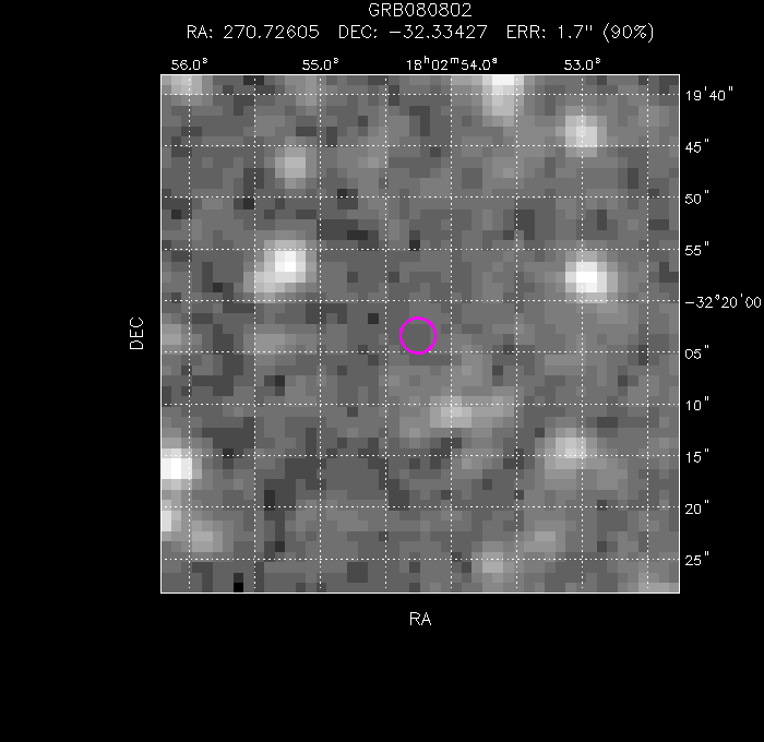 The image below shows the UVOT field with the final, astrometrically corrected XRT refined position. The image is 50" to a side, and contains 349 s of data in the B filter.