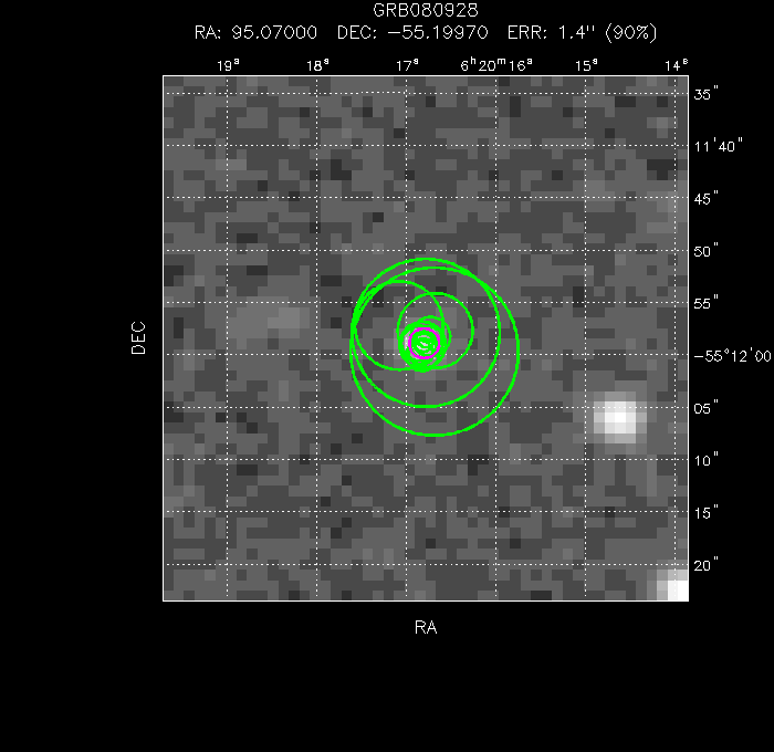 The image below shows the UVOT field with the final, astrometrically corrected XRT refined position. The image is 50" to a side, and contains 2e+03 s of data in the B filter.