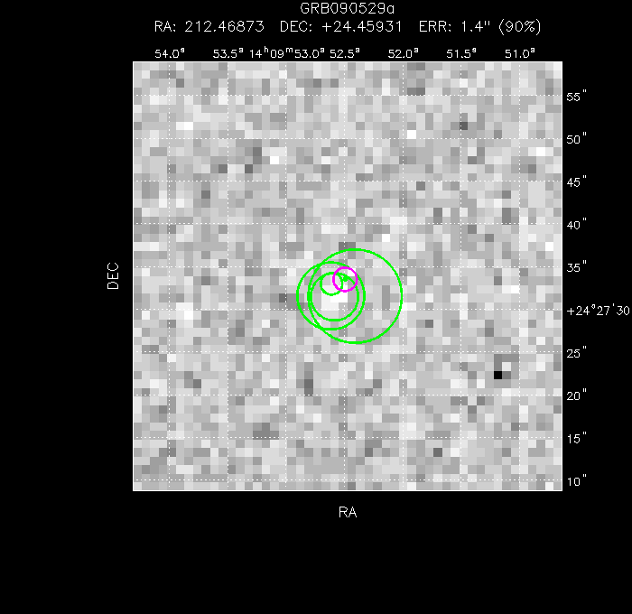 The image below shows the UVOT field with the final, astrometrically corrected XRT refined position. The image is 50" to a side, and contains 724 s of data in the WHITE filter.