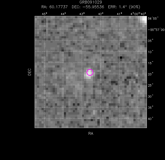 The image below shows the UVOT field with the final, astrometrically corrected XRT refined position. The image is 50" to a side, and contains 1e+03 s of data in the B filter.