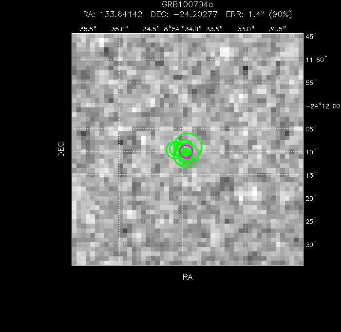 The image below shows the UVOT field with the final, astrometrically corrected XRT refined position. The image is 50" to a side, and contains 1e+03 s of data in the B filter.