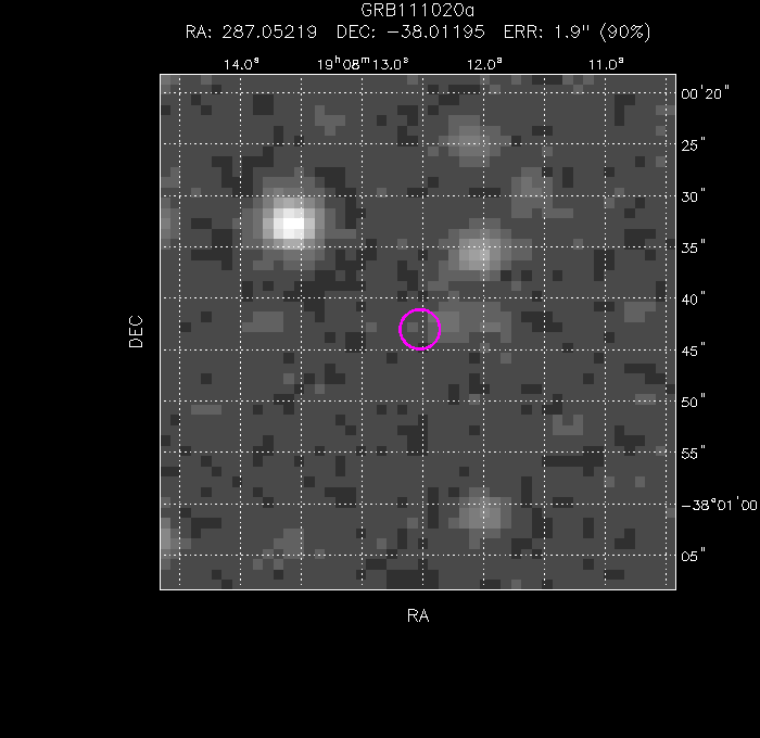 The image below shows the UVOT field with the final, astrometrically corrected XRT refined position. The image is 50" to a side, and contains 764 s of data in the WHITE filter.