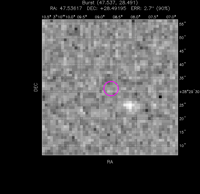 The image below shows the UVOT field with the final, astrometrically corrected XRT refined position. The image is 50" to a side, and contains 363 s of data in the WHITE filter.