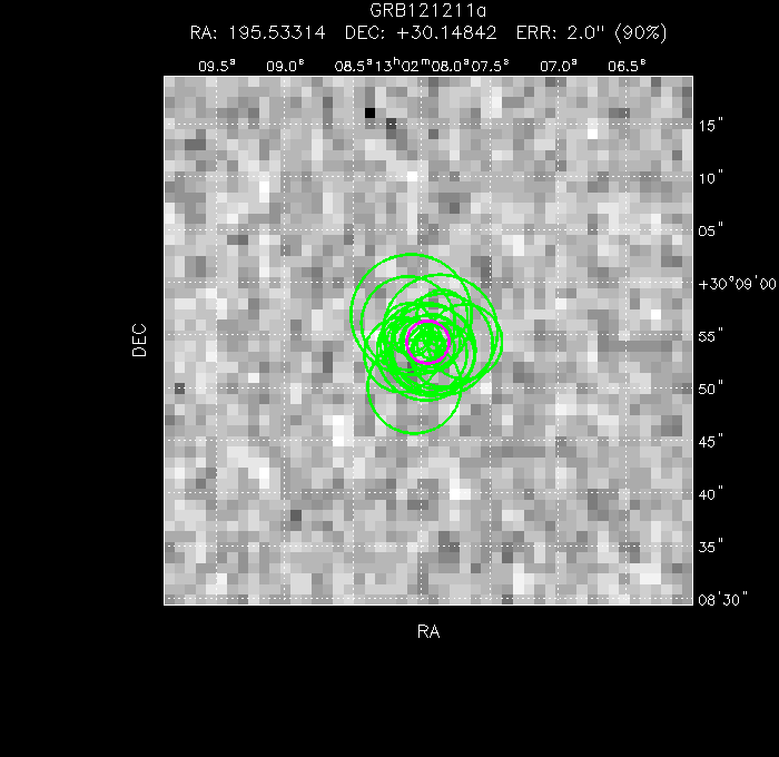 The image below shows the UVOT field with the final, astrometrically corrected XRT refined position. The image is 50" to a side, and contains 393 s of data in the V filter.