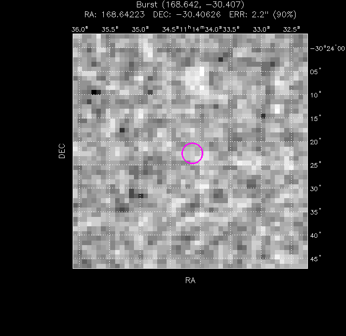 The image below shows the UVOT field with the final, astrometrically corrected XRT refined position. The image is 50" to a side, and contains 1e+03 s of data in the WHITE filter.