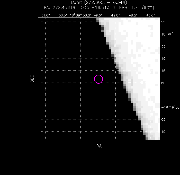 The image below shows the UVOT field with the final, astrometrically corrected XRT refined position. The image is 50" to a side, and contains 641 s of data in the WHITE filter.