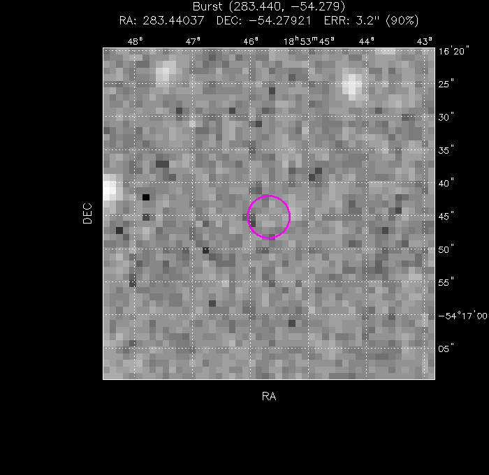 The image below shows the UVOT field with the final, astrometrically corrected XRT refined position. The image is 50" to a side, and contains 235 s of data in the V filter.