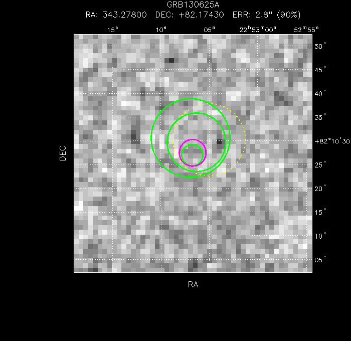 The image below shows the UVOT field with the final, astrometrically corrected XRT refined position. The image is 50" to a side, and contains 2e+03 s of data in the B filter.