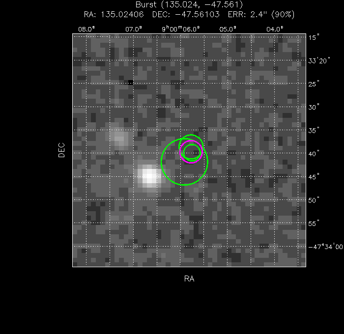 The final position (magenta) is the weighted mean of 3 positions (green). A further 0 positions were rejected, either because they had too few photons to be secure (red) or because they are more than 3 sigma away from the mean position, more than 40" from the early mean, or had a problematic astrometric correction (yellow). The image is 50" to a side.
