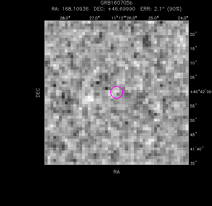 The image below shows the UVOT field with the final, astrometrically corrected XRT refined position. The image is 50" to a side, and contains 540 s of data in the WHITE filter.