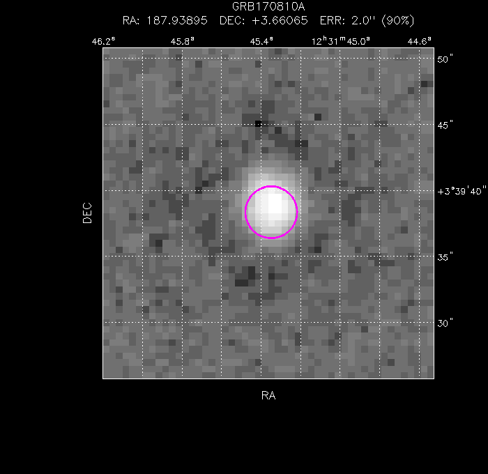 The image below shows the UVOT field with the final, astrometrically corrected XRT refined position. The image is 50" to a side, and contains 353 s of data in the WHITE filter.