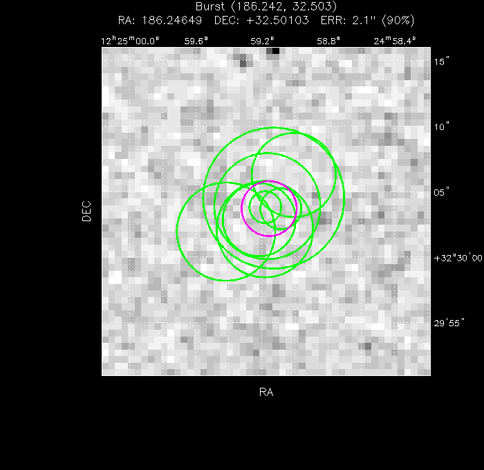 The image below shows the UVOT field with the final, astrometrically corrected XRT refined position. The image is 50" to a side, and contains 194 s of data in the B filter.