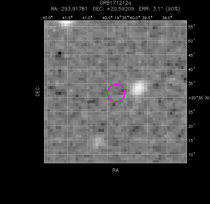 The image below shows the UVOT field with the final, astrometrically corrected XRT refined position. The image is 50" to a side, and contains 235 s of data in the V filter.