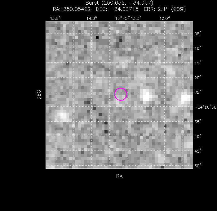 The image below shows the UVOT field with the final, astrometrically corrected XRT refined position. The image is 50" to a side, and contains 196 s of data in the V filter.