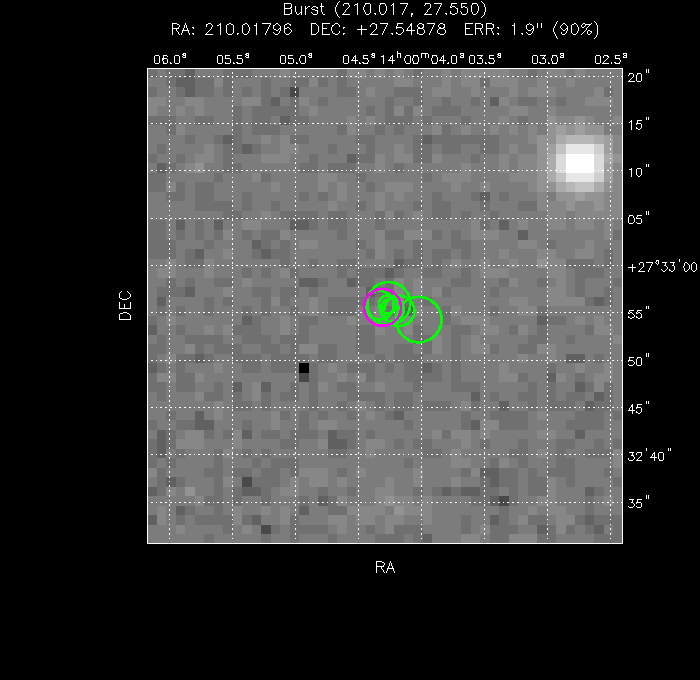 The image below shows the UVOT field with the final, astrometrically corrected XRT refined position. The image is 50" to a side, and contains 332 s of data in the B filter.
