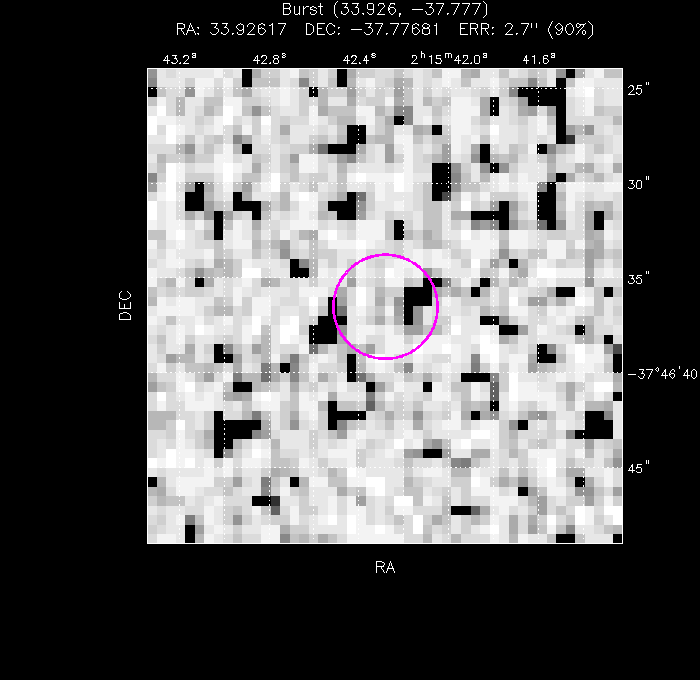 The image below shows the UVOT field with the final, astrometrically corrected XRT refined position. The image is 50" to a side, and contains 58 s of data in the V filter.